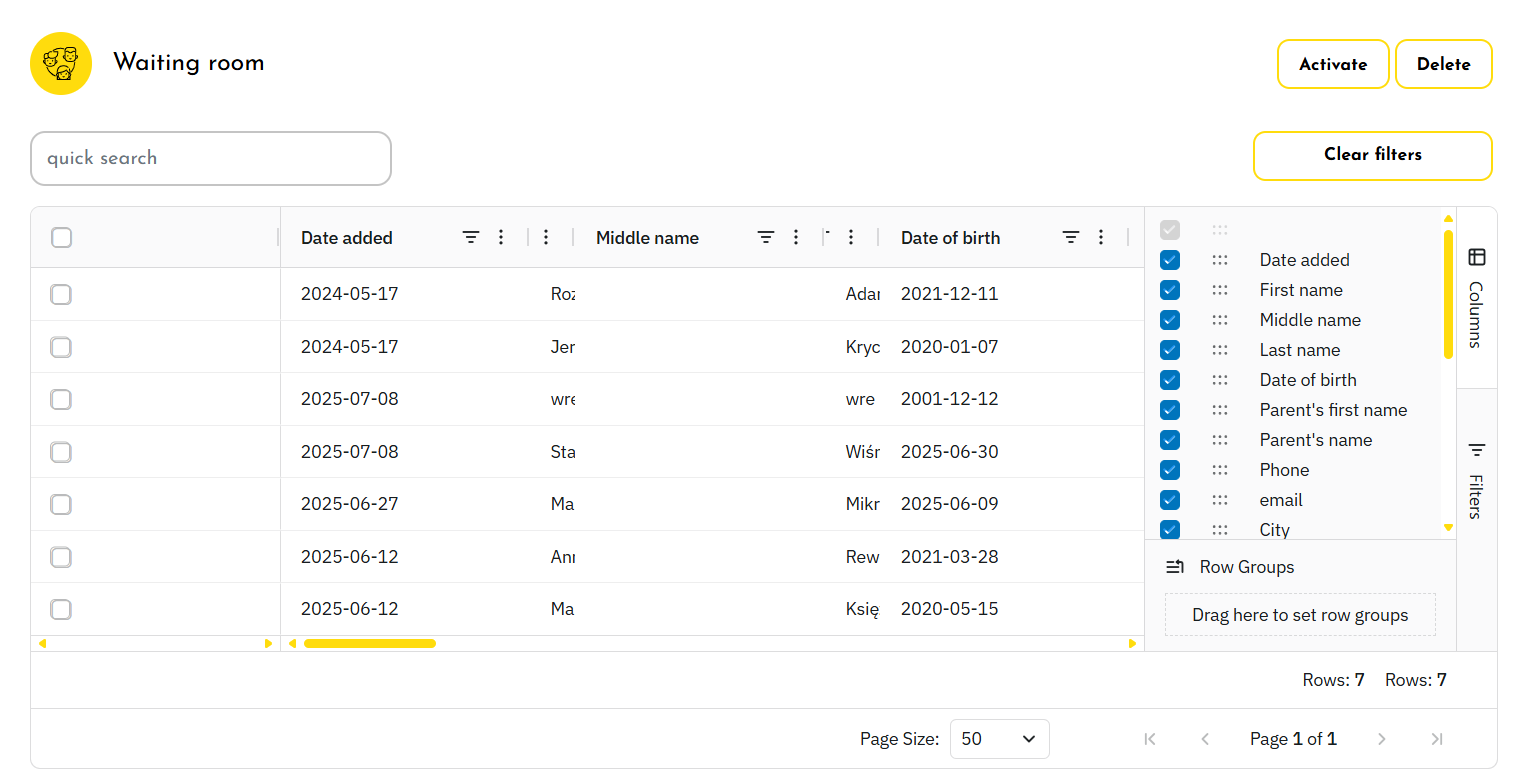 The Waiting Room is a list of sign-ups submitted through the registration form.