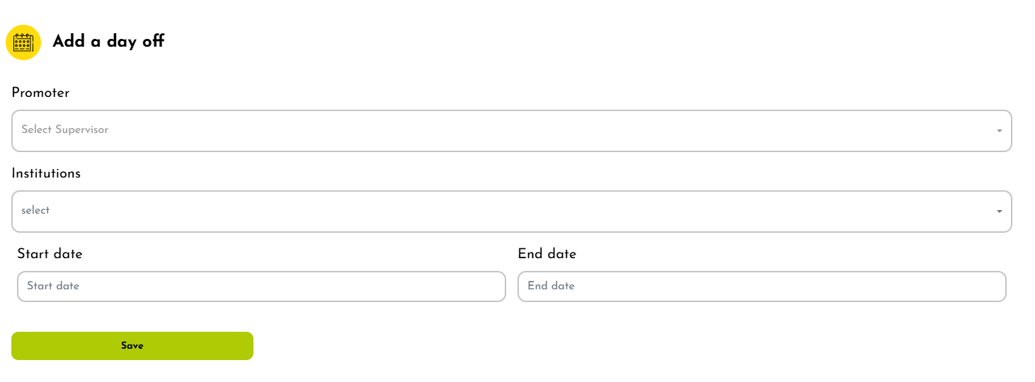 In the “Days off” tab, the promoter can add non-teaching days for either the selected institution or all available institutions.