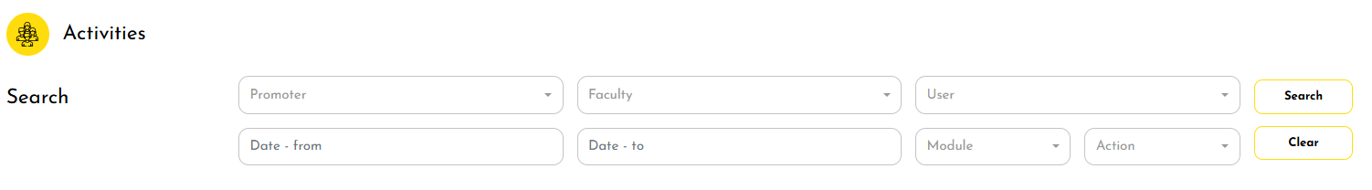 4. he list of activities can be narrowed down using the available filters, such as: Promoter, Institution, User, Date, Module, and Action type.