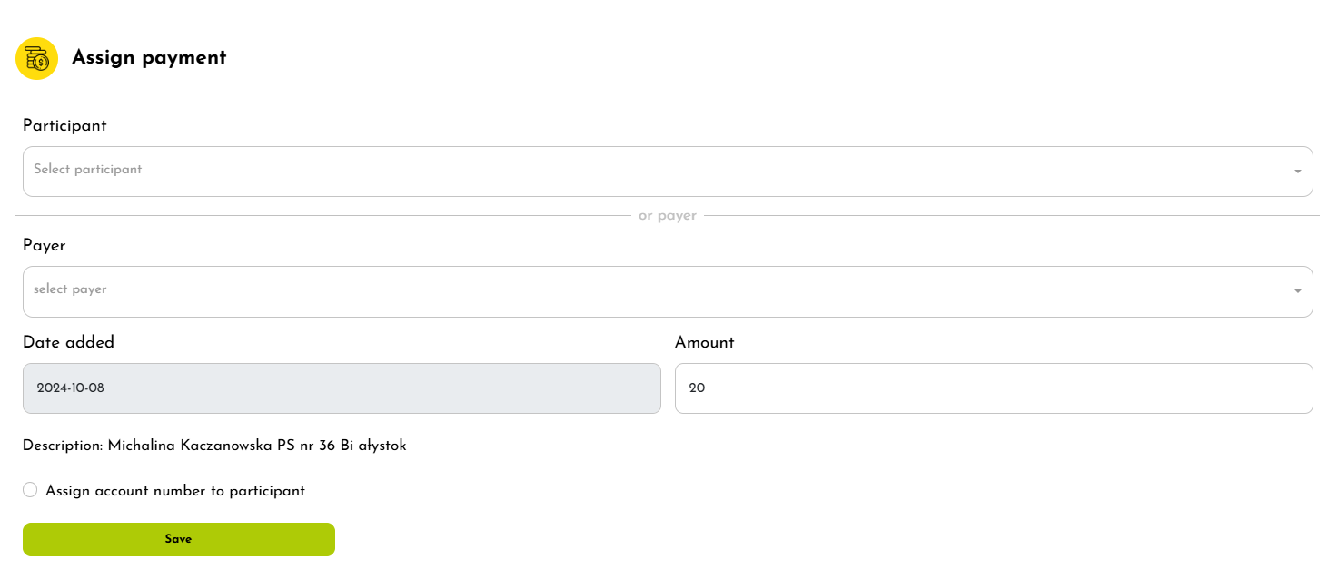 After saving, the payment will be assigned to the selected payer, and its status will automatically update on the list.